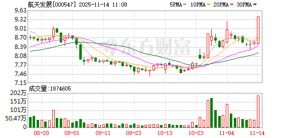 (文章来源:证券时报网) 数据宝统计,截至10:18,航天发展成交额15.36亿元,创2024年8月9日以来新高。最新股价上涨 10.06%,换手率10.40%。上一交易日该股全天成交额为3.82亿元。 据天眼查APP显示,航天工业发展股份有限公司成立于1993年11月20日,注册资本159846.8269万人民 币。(数据宝) ...