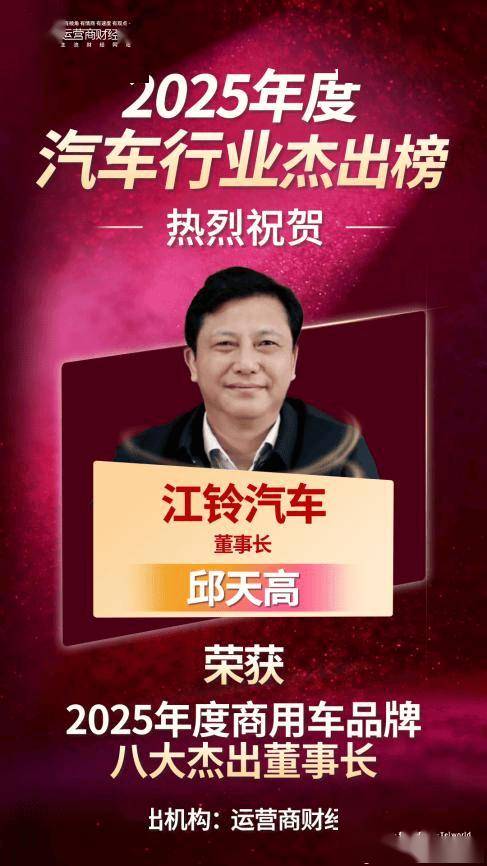 运营商财经网讯 作为汽车行业敏锐洞察者,国内知名财经媒体运营商财经网独家打造了"2025年度汽车行业杰出榜"系列 榜单,旨在以此反映汽车行业过去一年发展情况。日前,"2025年度商用车品牌八大杰出董事长"名单出 炉,引起业内关注! 运营商财经(官方微信公众号yyscjrd)—— 主流财经网站,一家全面覆盖科技、金融、证券、汽车、 房产、食品、医药、日化、酒业及其他各种消费品网站。 热烈祝贺江铃汽车董事长邱天高成功上榜!这离不开江铃汽车过去一年的出色业绩! 运营商财经网副总编辑康锐表示,运营商财经网推出的杰出榜系列榜单由运营商财经网独家打造,综合 考量企业业绩、高管个人能力等多种因素,公平公正公开! ...