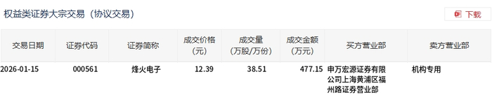 | 权益类证券大宗交易(协议交易) | | | | | | | | 团 下载 | | --- | --- | --- | --- | --- | --- | --- | --- | --- | | 交易日期 | 证券代码 | 证券简称 | 成交价格 (元) | 成交量 (万股/万份) | 成交金额 (万元) | 买方营业部 | 卖方营业部 | | | 2026-01-15 | 000561 | 烽火电子 | 12.39 | 38.51 | | 477.15 申万宏源证券有限 | 机构专用 | | | | | | | | | 公司上海黄浦区福 | | | | | | | | | | 州路证券营业部 | | | 1月15日,烽火电子大宗交易成交38.51万股,成交额477.15万元,占当日总成交额的0.36%,成交价 12.39元,较市场收盘价12.39元持平。 ...