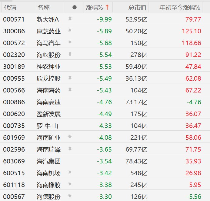 | 代码 | 名称 | | 涨幅% ↑ | 总市值 | 年初至今涨幅% | | --- | --- | --- | --- | --- | --- | | 000571 | 新大洲A | 1 | -9.99 | 52.95亿 | 79.77 | | 300086 | 康艺药业 | 演 | -5.89 | 50.20亿 | 125.10 | | 000572 | 海马汽车 | 兼 | -5.68 | 150亿 | 118.66 | | 002320 | 海峡股份 | 1 | -5.54 | 278亿 | 91.22 | | 300189 | 神农种业 | | -5.53 | 59.49 Z | 47.84 | | 000955 | 欣龙控股 | 1 = | -5.49 | 36.13亿 | 62.08 | | 000566 | 母南海药 | 1 | -5.43 | 104亿 | 67.22 | | 000886 | 海南高速 | | -4.76 | 73.17亿 | -4.76 | | 000620 | 盈新发展 | | -4.49 | 175亿 | 36.07 | | 000735 | 罗牛山 | | -4. ...