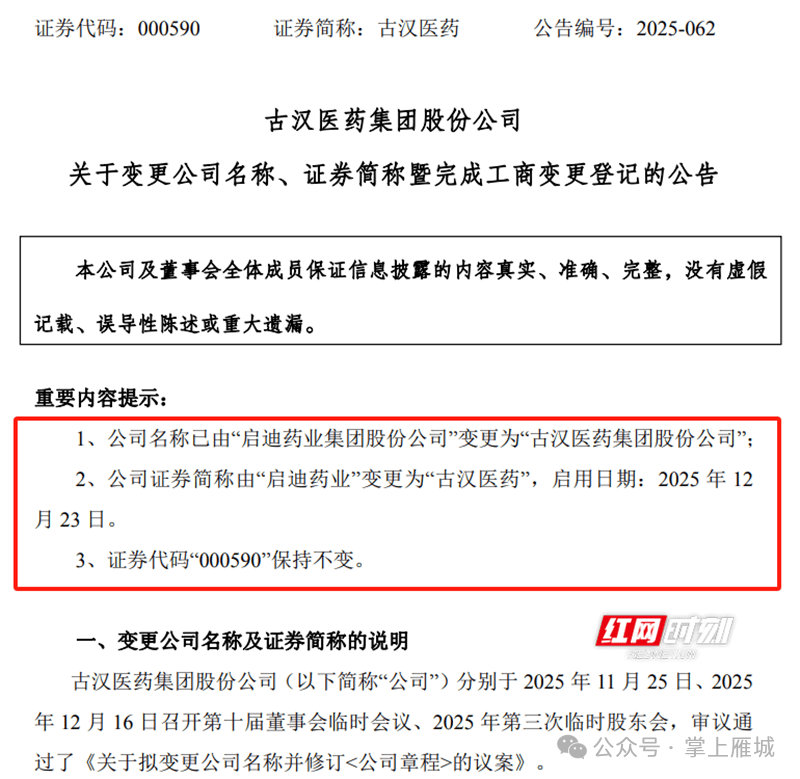 备受市场关注的启迪药业(000590)更名已尘埃落定。 ▲公司公告。 12月22日晚,启迪药业发布公告称,公司变更公司名称及证券简称的申请已经深圳证券交易所审核无异议。自 2025年12月23日起,公司证券简称由启迪药业变更为古汉医药,公司证券代码"000590"保持不变。 ▲公告信息。 此次更名并非突如其来。2025年7月,公司曾经历控股权变动。原控股股东启迪科服因金融借款合同纠纷,所持股 份被司法冻结并拍卖。经过138轮激烈出价,湖南赛乐仙管理咨询服务合伙企业(有限合伙)最终以10亿元竞得启 迪药业24.47%股权。 公司控股股东也由此变更为湖南赛乐仙,实际控制人变更为恒昌医药创始人、董事长江琎。从2200多年前的马王 堆古方"复活"的古汉养生精最终交棒于这位"80后"企业家。 随着股权结构落定,公司品牌战略也同步调整。公司表示,此次更名更好地体现了公司主营业务和行业特征,增 强消费者和投资者对公司品牌辨识度。 近日,公司在衡阳市市场监督管理局完成了公司名称变更登记手续和《公司章程》的备案,并取得换发的《营业 执照》。公司名称已由"启迪药业集团股份公司"变更为"古汉医药集团股份公司"。 古汉养生精是公司旗 ...