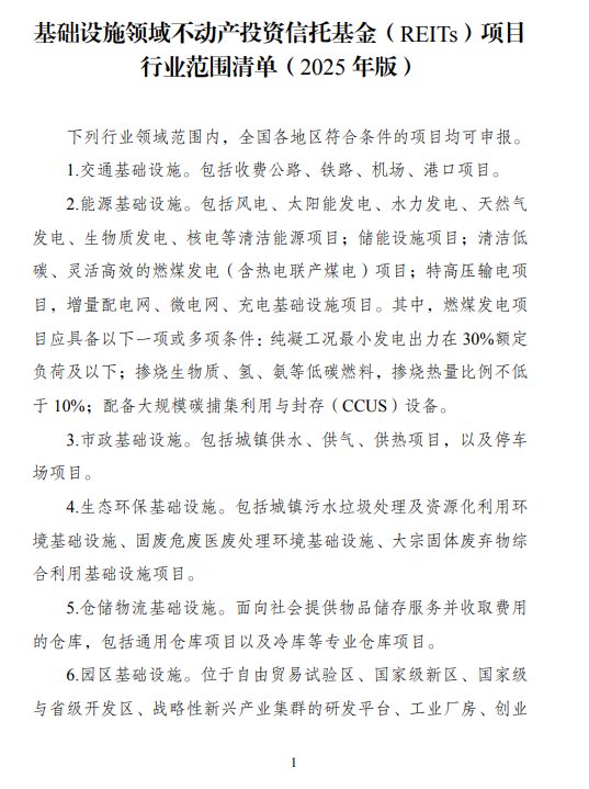 智通财经APP获悉,近日,国家发改委印发《基础设施领域不动产投资信托基金(REITs)项目行业范围 清单(2025年版)》的通知。各省级发展改革部门、有关中央企业要坚持"优中选优",严格把关项目质 量,强化风险意识,高质量做好项目申报工作。申报范围包括风电、太阳能发电、水力发电、天然气发 电、生物质发电、核电等清洁能源项目;储能设施项目;清洁低碳、灵活高效的燃煤发电(含热电联产 煤电)项目;特高压输电项目,增量配电网、微电网、充电基础设施项目。其中,燃煤发电项目应具备 以下一项或多项条件:纯凝工况最小发电出力在30%额定负荷及以下;掺烧生物质、氢、氨等低碳燃 料,掺烧热量比例不低于10%;配备大规模碳捕集利用与封存(CCUS)设备等。 原文如下: 国家发展改革委办公厅关于印发 《基础设施领域不动产投资信托基金(REITs) 项目行业范围清单(2025年版)》的通知 发改办投资〔2025〕991号 各省、自治区、直辖市及计划单列市、新疆生产建设兵团发展改革委,有关中央企业: 为贯彻落实党中央、国务院决策部署,根据《中共中央、国务院关于推动城市高质量发展的意见》《中 共中央办公厅、国务院办公厅关于持续推进城市更新 ...