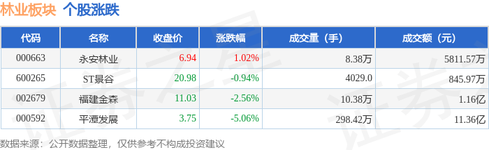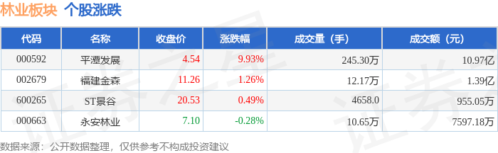 证券之星消息,10月24日林业板块较上一交易日上涨5.37%,平潭发展领涨。当日上证指数报收于 3950.31,上涨0.71%。深证成指报收于13289.18,上涨2.02%。林业板块个股涨跌见下表: | 代码 | 名称 | 收盘价 | 涨跌幅 | 成交量(手) | 成交额(元) | | | --- | --- | --- | --- | --- | --- | --- | | 000592 | 平潭发展 | 4.54 | 9.93% | 245.30万 | | 10.97 Z | | 002679 | 福建金森 | 11.26 | 1.26% | 12.17万 | | 1.39 Z | | 600265 | ST景谷 | 20.53 | 0.49% | 4658.0 | | 955.05万 | | 000663 | 永安林业 | 7.10 | -0.28% | 10.65万 | | 7597.18万 | 从资金流向上来看,当日林业板块主力资金净流入1.28亿元,游资资金净流出9017.9万元,散户资金净流 出3799.99万元。林业板块个股资金流向见下表: | 代码 | 名称 | 主力净流入 (元) | | ...