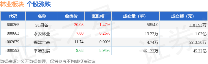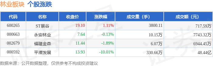 | 代码 | 名称 | 收盘价 | 涨跌幅 | 成交量(手) | 成交额(元) | | --- | --- | --- | --- | --- | --- | | 600265 | ST景谷 | 20.08 | 1.47% | 5854.0 | 1181.93万 | | 000663 | 永安林业 | 7.80 | 0.26% | 13.22万 | 1.02亿 | | 002679 | 福建金森 | 11.74 | 0.00% | 4.74万 | 5513.50万 | | 000592 | 平潭发展 | 9.68 | -8.94% | 461.22万 | 45.22 乙 | 以上内容为证券之星据公开信息整理,由AI算法生成(网信算备310104345710301240019号),不构成投资建议。 证券之星消息,1月21日林业板块较上一交易日下跌6.32%,平潭发展领跌。当日上证指数报收于 4116.94,上涨0.08%。深证成指报收于14255.12,上涨0.7%。林业板块个股涨跌见下表: | 代码 | 名称 | | | 主力净流入(元) 主力净占比 游资净流入(元) 游资净占比 散户净流入 (元) 散户净占 ...