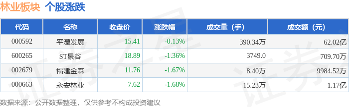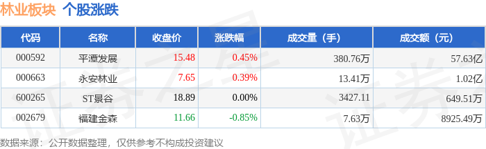 证券之星消息,1月14日林业板块较上一交易日上涨0.32%,平潭发展领涨。当日上证指数报收于 4126.09,下跌0.31%。深证成指报收于14248.6,上涨0.56%。林业板块个股涨跌见下表: | 代码 | 名称 | 收盘价 | 涨跌幅 | 成交量(手) | 成交额(元) | | | --- | --- | --- | --- | --- | --- | --- | | 000592 | 平潭发展 | 15.48 | 0.45% | 380.76万 | | 57.63 Z | | 000663 | 永安林业 | 7.65 | 0.39% | 13.41万 | 1.02亿 | | | 600265 | ST景谷 | 68'81 | 0.00% | 3427.11 | | 649.51万 | | 002679 | 福建金森 | 11.66 | -0.85% | 7.63万 | | 8925.49万 | | 代码 | 名称 主力浄流入(元) | | | | 主力净占比 游资净流入 (元) 游资净占比 散户净流入 (元) 散户净占比 | | | | --- | --- | --- | --- | --- | -- ...