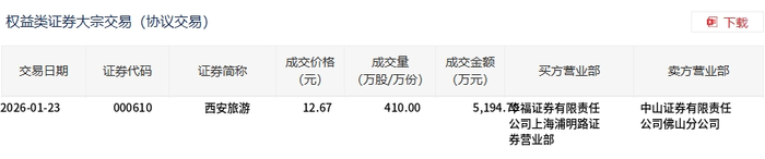 | 权益类证券大宗交易(协议交易) | | | | | | | 团 下载 | | --- | --- | --- | --- | --- | --- | --- | --- | | 交易日期 | 证券代码 | 证券简称 | 成交价格 (元) | 成交量 (万股/万份) | 成交金额 (万元) | 买方营业部 | 卖方营业部 | | 2026-01-23 | 000610 | 西安旅游 | 12.67 | 410.00 | 5,194. 降福证券有限责任 | | 中山证券有限责任 | | | | | | | 劳营业部 | 公司上海浦明路证 | 公司佛山分公司 | 1月23日,西安旅游大宗交易成交410万股,成交额5194.7万元,占当日总成交额的19.25%,成交价 12.67元,较市场收盘价12.99元折价2.46%。 ...