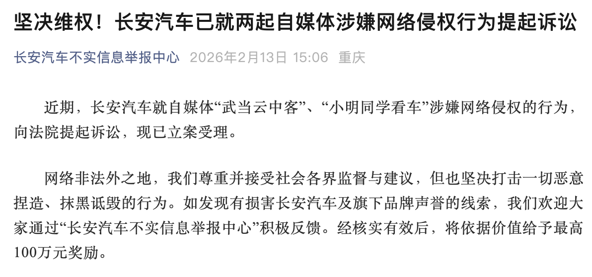网络非法外之地,我们尊重并接受社会各界监督与建议,但也坚决打击一切恶意捏造、抹黑诋毁的行为。 据长安汽车不实信息举报中心公众号,长安汽车表示,如发现有损害长安汽车及旗下品牌声誉的线索,我们欢迎大家通过公众号"长安汽车不实信息举报 中心"积极反馈。经核实有效后,将依据价值给予最高100万元奖励。 每经编辑|张锦河 2月13日,长安汽车法务部发文称,近期,长安汽车就自媒体"武当云中客"、"小明同学看车"涉嫌网络侵权的行为,向法院提起诉讼,现已立案受理。 有网友回忆,此前曾刷到过两个账号发布的相关内容,其中部分表述与长安汽车官方信息存在明显偏差。有业内人士推测,其被起诉的具体原因,大概率 是发布了未经核实的车型质量缺陷、虚假宣传等不实言论,误导消费者的同时,损害了长安汽车的品牌形象。 每日经济新闻综合长安汽车法务部、大河报 据悉,两大自媒体被起诉的核心原因,是涉嫌发布恶意捏造、抹黑诋毁长安汽车及旗下品牌声誉的内容,违反网络传播相关规定,构成侵权。 据大河报,不少关注汽车领域的网友发现,近期"武当云中客""小明同学看车"的部分内容已无法正常查看,此前这两个账号常发布汽车测评、车型解读类 内容,在汽车爱好者群体中拥有一 ...