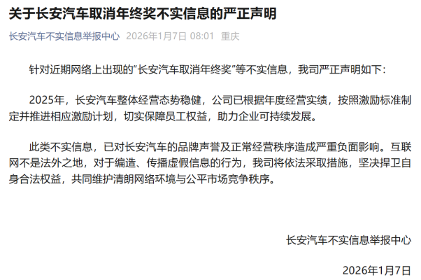 【导读】长安汽车称"取消年终奖"为不实信息,2025年整体经营态势稳健 中国基金报记者 晨曦 长安汽车"取消年终奖"?最新回应来了! 1月7日上午,长安汽车不实信息举报中心发布《关于长安汽车取消年终奖不实信息的严正声 明》。 此类不实信息,已对长安汽车的品牌声誉及正常经营秩序造成严重负面影响。互联网不是法 外之地,对于编造、传播虚假信息的行为,公司将依法采取措施,坚决捍卫自身合法权益, 共同维护清朗网络环境与公平市场竞争秩序。 据了解,近日有相关报道称,长安汽车因2025年销量未达目标而取消员工年终奖,引发员工 不满。 报道称,长安汽车某部门近日发布通知称,鉴于2025年公司销量、利润率等指标未达成年终 目标,所以今年没有年终激励奖;公司考虑到各位员工的辛苦付出,2月份过年前会有一个相 应激励,但暂时没有出相关方案,具体激励等待通知。 大量网友在社交平台上参与讨论该话题,相关通知截图也在网络上广为流传。 长安汽车称,针对近期网络上出现的"长安汽车取消年终奖"等不实信息,公司严正声明如 下: 2025年,长安汽车整体经营态势稳健,公司已根据年度经营实绩,按照激励标准制定并推进 相应激励计划,切实保障员工权益,助 ...