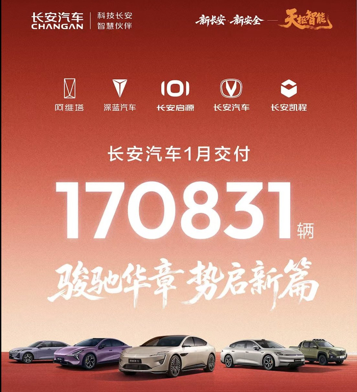 本报讯 (记者冯雨瑶)2026年2月5日,重庆长安汽车股份有限公司(以下简称"长安汽车")发布2026 年1月全球销量交付数据。在行业传统淡季与主动调整内部交付节奏的背景下,长安汽车实现170831辆 的全球交付量,旗下经典车型与新能源产品线均展现出稳健态势,为"十五五"规划元年的高质量发展奠 定了坚实基础。 经典基盘与新能源跃升并举 产品矩阵韧性凸显 面对激烈的竞争,长安汽车开年的稳健步伐,源于对"三大计划"的坚定推进与持续收获。一方面,公司 稳步推进新能源"香格里拉"计划,构建了阿维塔、深蓝汽车、长安启源三大全球数智新能源品牌矩阵。 按照规划,今年三季度前自主研发的"金钟罩"固态电池预计进入装车验证阶段,前瞻布局下一代动力技 术。 另一方面,公司加快实施智能化"北斗天枢"计划,打造了全球领先的中央环网SDA平台,发布"新长安 新安全——天枢智能"品牌,将安全延伸到行车、健康、心理、隐私的全维度"泛安全",并已获颁全国 首块L3级自动驾驶专用正式号牌,率先开启高阶智驾合规量产新阶段。目前,长安汽车正在零下30℃ 极寒的牙克石,宣布全球首款钠电池量产乘用车正式上车,硬核开炼2026全球炼车季。 此外,长安汽车 ...