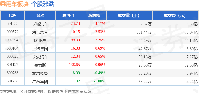 | 代码 | 名称 | 主力净流入(元) | 主力净占比 游资净流入 (元) | | 游资净占比 散户净流入 (元) | | 散户净占比 | | --- | --- | --- | --- | --- | --- | --- | --- | | 002594 | 比亚迪 | 5.87 Z | 10.64% | -3.42 Z | -6.21% | -2.44/Z | -4.43% | | 601633 长城汽车 | | 1.00 Z | 11.29% | -1270.20万 | -1.43% | -8768.60万 | -9.86% | | 000625 长安汽车 | | 790.08万 | 1.09% | -4452.22万 | -6.12% | - 3662.14万 | 5.04% | | 601238 广汽集团 | | -2803.16万 | -6.61% | 1282.73万 | 3.03% | 1520.43万 | 3.59% | | 600733 北汽蓝谷 | | -4527.24万 | -6.50% | -327.23万 | -0.47% | 4854.47万 | 6.97% | | 60010 ...
