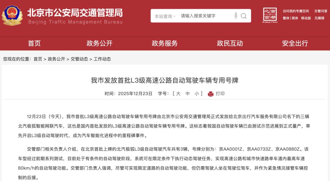 L3级自动驾驶迈入"合法通行"新阶段。 12月23日,北京首批L3级高速公路自动驾驶车辆专用号牌由北京市公安局交通管理局正式发放给北京出行汽车服务有限公司名下的三辆北汽极狐智能网 联汽车,这也是国内首批发放的L3级高速公路自动驾驶车辆专用号牌。 这标志着我国自动驾驶车辆已由测试示范进展到正式量产,率先开启L3级自动驾驶时代。 北京市公安局交通管理局发布公告 极狐汽车也在官方社交账号上发文表示,首批L3级自动驾驶专用正式号牌安装于极狐阿尔法S(L3版)车型上,这标志着极狐汽车不仅完成了产品准入的 认证,更顺利走完了上牌登记的全流程,真正从"技术验证"迈入"合法通行"的实战新阶段。 与此同时,极狐汽车通过直播方式,向公众展示了其L3级自动驾驶技术的实际体验。直播中,北汽L3级自动驾驶准入试点项目总师王岩表示,获得准入 许可则相当于取得"毕业证",表明产品安全性已通过国家主管部门的完整验证,具备上市销售资格,车辆身份也从研发状态正式转变为量产车。 王岩(右)对L3相关政策与技术进行解读 "新车是与战略合作伙伴华为开展的联合深度定制化开发,已经进行了小批量的量产。"王岩进一步表示,L3级自动驾驶车辆暂未向个人消费者开 ...
