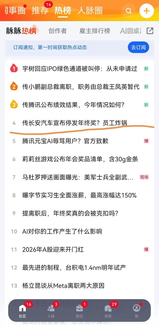 来源:金石杂谈 1月5日消息,今天一则消息彻底刷屏,在社区平台一条"传长安汽车宣布停发年终奖,员工炸锅"的帖子 直接上了热搜榜第四名。 根据社区平台消息,一张聊天截图显示:鉴于今年公司销量、利润率等指标未完成年度目标,所以今年 没有年终激励奖。但是,公司考虑到各位员工的辛苦付出,2月过年前会有一个相应激励,但这哪是没 有相关方案,具体激励等通知。 消息一出,市场纷纷猜测是哪家车企?有网友直言:长安,你直接报我名字好了。新浪科技报道,传长 安汽车因2025年销量未达目标而取消员工年终奖引发不满。针对传闻,截至发稿前,长安汽车方面暂无 回应。 而在社区平台,不少长安汽车纷纷吐槽:对员工不好的公司,产品能好到哪去?这一波堪比当初的价格 背刺老客户。 还有备注为长安汽车的员工表示:忍一时越想越气,退一步越想越亏。入职前说的起步15薪,月度工资 还砍了点,现在剩下的3薪不发了,工作几年工资倒退。 据网友透露,长安汽车一般年终奖是1-10个月,技术岗能拿到5个月,核心员工能拿到10万+。据悉,去 年长安汽车员工能拿到平均4.8个月薪资的年终奖。而今年只剩下安慰奖了,一人1000元的阳光普照 吗? 同行来看,长城早就改成双 ...