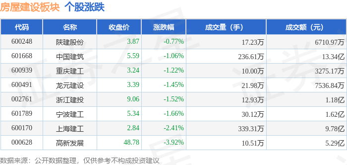 从资金流向上来看,当日房屋建设板块主力资金净流入2745.6万元,游资资金净流出6450.74万元,散户 资金净流入3705.14万元。房屋建设板块个股资金流向见下表: 证券之星消息,10月21日房屋建设板块较上一交易日上涨1.25%,龙元建设领涨。当日上证指数报收于 3916.33,上涨1.36%。深证成指报收于13077.32,上涨2.06%。房屋建设板块个股涨跌见下表: | 代码 | 名称 | 收盘价 | 涨跌幅 | 成交量(手) | 成交额(元) | | --- | --- | --- | --- | --- | --- | | 600491 | 龙元建设 | 3.62 | 5.54% | 68.75万 | 2.44亿 | | 600939 | 重庆建工 | 3.41 | 4.60% | 18.42万 | 6187.66万 | | 002761 | 浙江建投 | 9.38 | 2.85% | 20.26万 | 1.89亿 | | 600248 | 陕建股份 | 3.95 | 2.07% | 29.56万 | 1.16亿 | | 600170 | ┣海建工 | 2.91 | 1.75% | 350.34 ...