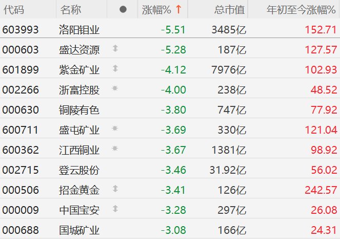 | 代码 | 名称 | . | 涨幅%↑ | 总市值 | 年初至今涨幅% | | --- | --- | --- | --- | --- | --- | | 603993 | 洛阳钳业 | | -5.51 | 3485亿 | 152.71 | | 000603 | 盛达资源 | 1 | -5.28 | 187亿 | 127.57 | | 601899 | 蒙令矿业 | 1 | -4.12 | 7976 Z | 102.93 | | 002266 | 浙富控股 | 策 | -4.00 | 238亿 | 48.52 | | 000630 | 铜陵有色 | | -3.80 | 747亿 | 77.92 | | 600711 | 盛屯矿业 | 策 | -3.69 | 330亿 | 121.04 | | 600362 | 江西铜业 | 演 | -3.67 | 1381亿 | 98.92 | | 002715 | 登云股份 | | -3.46 | 31.92亿 | 56.02 | | 000506 | 招金黄金 | 1 | -3.41 | 126亿 | 242.57 | | 000009 | 中国宝安 | 1 | -3. ...