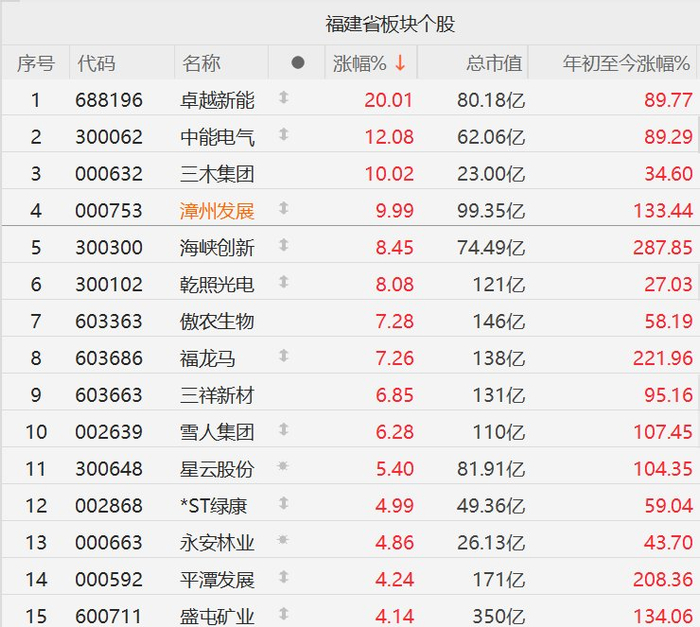 Group 1 - The A-share market in Fujian experienced a significant rally, with companies such as Sanmu Group and Zhangzhou Development seeing their stocks surge and hit the daily limit [1] - Other companies including Haixia Innovation, Qianzhao Optoelectronics, Fulongma, Aonong Biological, Xiamen Port, Pingtan Development, Mindong Electric Power, and Lupu Information also saw notable increases in their stock prices [1]
