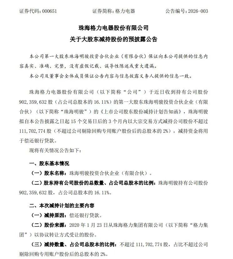 格力电器(000651)于2月25日发布公告,宣布其第一大股东珠海明骏投资合伙企业(有限合伙)计划通 过大宗交易方式减持不超过公司总股本2%的股份。该行为旨在偿还即将到期的银行贷款,这也是高瓴 资本自2020年以416.62亿元收购格力电器控制权以来首次在二级市场公开披露减持计划。 目前,珠海明骏持有格力电器902,359,632股,占公司总股本的16.11%,是公司的最大股东。根据公告 内容,此次减持将在公告发布后15个交易日后启动,并在三个月内完成。所得资金将全部用于偿还银行 贷款,所涉股份来源于2020年初从格力集团协议转让获得的权益。 格力电器强调,此次减持属于珠海明骏履行完股份锁定承诺后的常规财务安排,不会导致公司控制权变 更,也不会对公司的治理结构和日常运营产生实质性影响。 珠海明骏由高瓴资本主导设立,参与了格力电器的混合所有制改革。2019年,高瓴资本以416.62亿元受 让格力电器15%的股份,其中部分资金依赖银行融资。因此,此次减持主要为了满足相关贷款的偿付需 求。以格力电器2026年2月25日收盘价38.49元/股计算,若按上限减持,预计可回笼约43亿元资金。 六年来,格力电器持续实施高比 ...