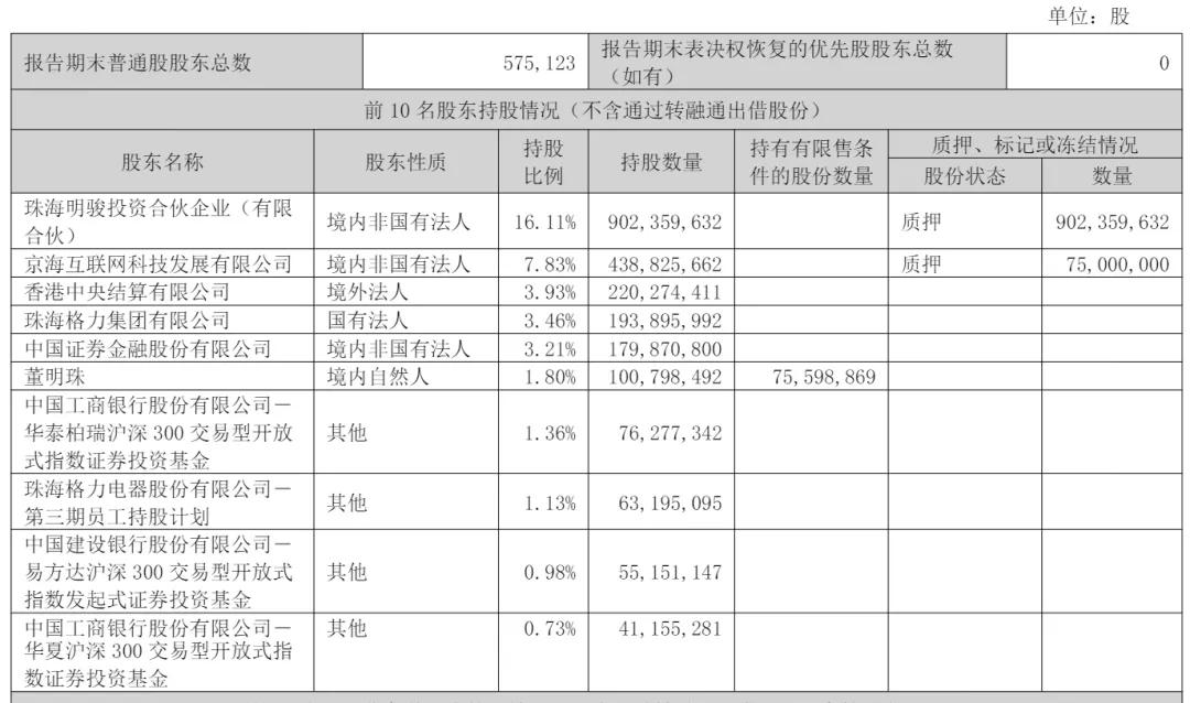 珠海格力电器股份有限公司(证券代码:000651,证券简称:格力电器)今日(25日)发布公告,宣布于近日收到持有公司股份902,359,632股(占公司总 股本的16.11%)的第一大股东珠海明骏投资合伙企业(有限合伙)(简称"珠海明骏")的《上市公司股东股份减持计划告知函》。 | 报告期末普通股股东总数 | | 575. 123 | | 报告期末表决权恢复的优先股股东总数 | | 0 | | --- | --- | --- | --- | --- | --- | --- | | | | | (如有) | | | | | | 前 10 名股东持股情况(不含通过转融通出借股份) | | | | | | | 股东名称 | 股东性质 | 持股 | 持股数量 | 持有有限售条 | 质押、标记或冻结情况 | | | | | 比例 | | 件的股份数量 | 股份状态 | 数量 | | 珠海明骏投资合伙企业(有限 | 境内非国有法人 | 16. 11% | 902, 359, 632 | | 质押 | 902, 359, 632 | | 合伙) | | | | | | | | 京海互联网科技发展有限公司 | 境内非国有法人 ...