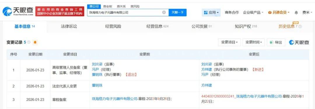 珠海格力电子元器件有限公司成立于2022年7月,注册资本1亿人民币,经营范围包括电子元器件制造、电子元器件批发、电力电子元器件制造等。股东信 息显示,该公司由格力电器全资持股。 (天眼查) 1月26日,天眼查工商信息显示,珠海格力电子元器件有限公司发生重要人事变更:董明珠卸任法定代表人、执行董事职务,由方祥建接任法定代表人并 担任执行公司事务的董事。这是2026年开年以来,格力系公司首次出现董明珠职务变动。 | | | 都在用的简业查询工具 | 液风险 查公司 查考版 商关系 | | | | | | | --- | --- | --- | --- | --- | --- | --- | --- | --- | | | | 家中小企业发展子具全旗下机构 | 珠海格力电子元器件有限公司 | 8 天殿一下 | 脂 应用 · | | 商务合作 企业级产品、 ★ 开通会员, ▲ 费米· | | | 基本信息 14 | | 法律诉讼 | 经营风险 | 经营信息 624 | 公司发展 51 | 知识产权 218 | | 历史信息7 0 | | 变更记录 5 @ @ | | | | | | 变更项目, 变更时间, | ■ 青 ...