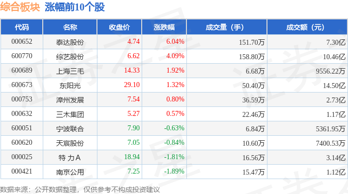 从资金流向上来看,当日综合板块主力资金净流出1.76亿元,游资资金净流入835.72万元,散户资金净流 入1.68亿元。综合板块个股资金流向见下表: | 代码 | 名称 | 收盘价 | 涨跌幅 | 成交量(手) | 成交额(元) | | --- | --- | --- | --- | --- | --- | | 000833 | 粤桂股份 | 22.25 | -4.14% | 44.27万 | 9.85 G | | 600682 | 南京新白 | 7.27 | -2.68% | 36.94万 | 2.68亿 | | 000523 | 红棉股份 | 4.02 | -2.66% | 63.80万 | 2.57亿 | | 600881 | ▼泰集团 | 1.85 | -2.12% | 53.20万 | 9845.78万 | | 600805 | 倪达投资 | 5.74 | -2.05% | 21.47万 | 1.23亿 | | 000421 | 南京公用 | 7.25 | -1.89% | 15.47万 | 1.12亿 | | 000025 | 特 | 18.94 | -1.81% | 16.56万 | 3.14亿 ...