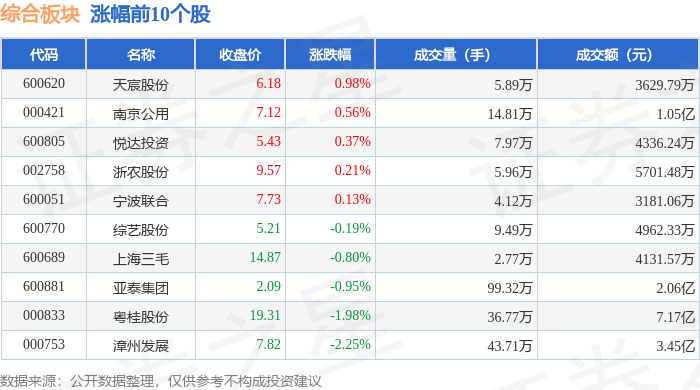 从资金流向上来看,当日综合板块主力资金净流出2.48亿元,游资资金净流入5583.94万元,散户资金净 流入1.92亿元。综合板块个股资金流向见下表: | 代码 | 名称 | 主力净流入(元) | 主力净占比 游资净流入 (元) | | 游资净占比 散户净流入 (元) | | 散户净占比 | | --- | --- | --- | --- | --- | --- | --- | --- | | 000632 | 三木集团 | 3524.63万 | 4.90% | -1551.21万 | -2.16% | -1973.41万 | -2.75% | | 600881 | 亚泰集团 | 503.44万 | 2.45% | -669.77万 | -3.26% | 166.33万 | 0.81% | | 002758 浙农股份 | | 405.43万 | 7.11% | 95.58万 | 1.68% | -501.01万 | -8.79% | | 600805 | 悦达投资 | 266.73万 | 6.15% | 258.76万 | 5.97% | -525.50万 | -12.12% | | 600051 | 宁波联 ...