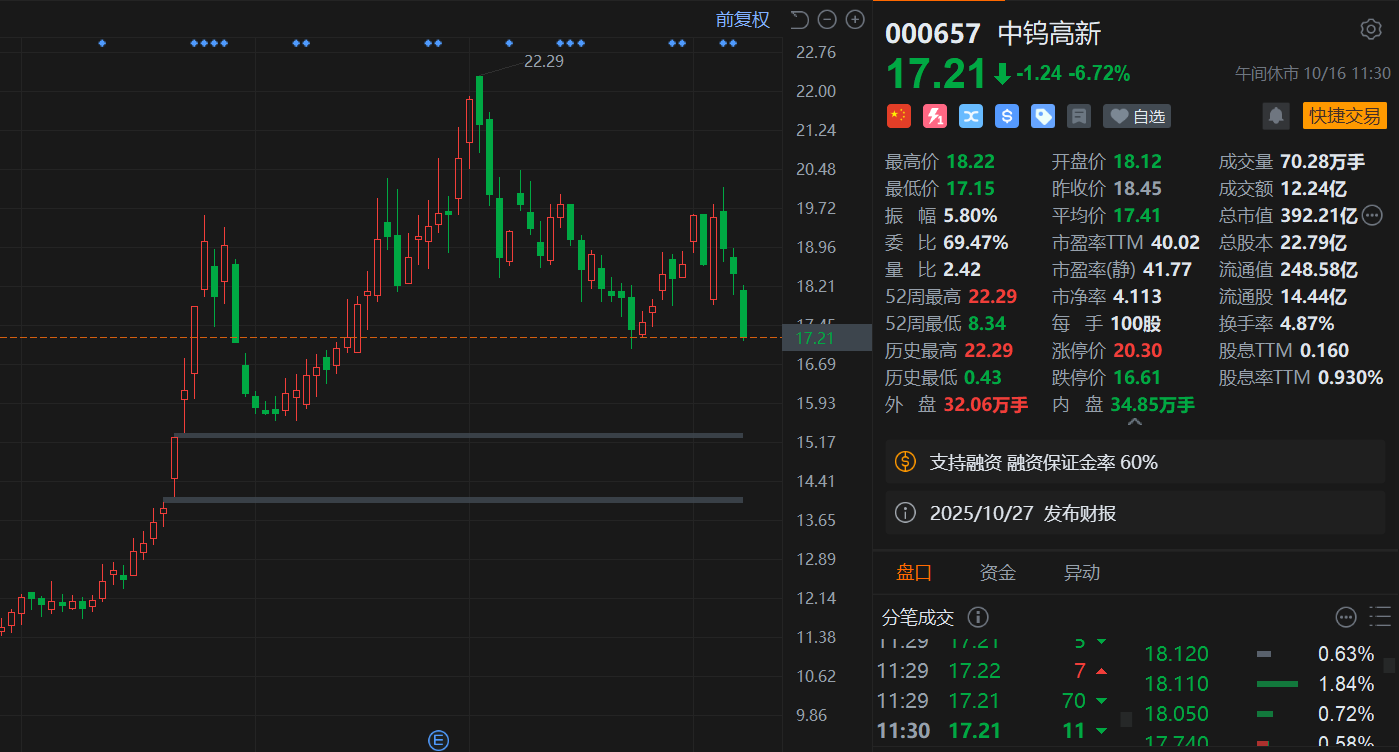 Core Viewpoint - Zhongtung High-tech (000657.SZ) experienced a 6.7% decline in share price, closing at 17.21 yuan, with its market capitalization falling below 40 billion yuan due to the unlocking of 189 million restricted shares on October 16, which represents 8.31% of the company's total equity [1]. Summary by Relevant Sections Share Price Movement - The stock price of Zhongtung High-tech dropped by 6.7% to 17.21 yuan, with a market cap now under 40 billion yuan [1]. - The stock reached a high of 18.22 yuan and a low of 17.15 yuan during the trading session [2]. Share Unlocking Details - On October 16, 1.89 million restricted shares were unlocked, which is part of a directed placement to institutional investors [1]. - In the past year, a total of 8.05 million shares have been unlocked, accounting for 0.35% of the total equity [1]. - After this unlocking event, there are still 835 million restricted shares remaining, which constitutes 36.62% of the total equity [1].