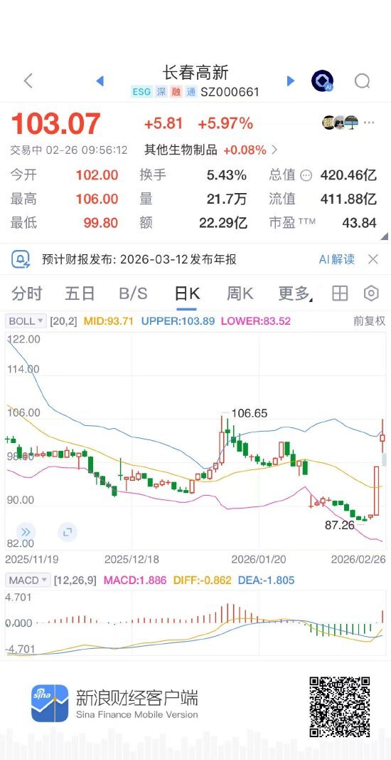 0.000 .. -4.701 ■ 在 rota to 新浪财经客户端 2 2 1 3 A sina the Sina Finance Mobile Version er 論 193 limily.all(... billathal) 来源:股市直击 2月26日,生物制品板块短线拉升,长春高新触及涨停,三生国健涨超7%,欧林生物、特宝生物、荣昌 生物跟涨。 长春高新受到关注的核心驱动力来自创新药领域的多项关键突破。公司自研的全球首款儿童小阴茎治疗 软膏获批临床,伏欣奇拜单抗作为国内首个IL-1β单抗上市后销售强劲且多地缺货。更重要的是, GenSci098注射液获得13.65亿美元海外BD大单且首付款已到账,为公司带来重大业务增量。公司正从 传统生长激素业务向肿瘤、免疫、内分泌等多管线创新药转型,这些积极进展引发市场广泛关注。 ...