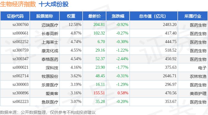 资金流向方面,生物经济(970038)指数成份股当日主力资金净流出合计13.82亿元,游资资金净流入合 计2415.92万元,散户资金净流入合计13.58亿元。成份股资金流向详情见下表: | 代码 | 名称 | 主力净流入(元) | 主力净占比 游资净流入 (元) | | 游资净占比 散户净流入(元) | | 散户净占比 | | --- | --- | --- | --- | --- | --- | --- | --- | | 300896 | 爱美客 | 2657.72万 | 6.95% | -613.50万 | -1.60% | -2044.22万 | -5.34% | | 300049 | 福瑞股份 | 2583.63万 | 7.28% | -781.87万 | -2.20% | -1801.76万 | -5.08% | | 000661 | 长春高新 | 884.18万 | 2.00% | -1070.43万 | -2.42% | 186.25万 | 0.42% | | 002223 | 鱼跃医疗 | 604.16万 | 4.16% | -255.19万 | -1.76% | -348.97万 | - ...