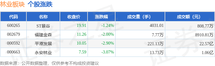 证券之星消息,2月2日林业板块较上一交易日下跌2.67%,永安林业领跌。当日上证指数报收于 4015.75,下跌2.48%。深证成指报收于13824.35,下跌2.69%。林业板块个股涨跌见下表: | 代码 | 名称 | 收盘价 | 涨跌幅 | 成交量(手) | 成交额(元) | | --- | --- | --- | --- | --- | --- | | 600265 | ST景谷 | 19.91 | -1.24% | 4031.01 | 808.77万 | | 002679 | 福建金森 | 11.26 | -2.00% | 7.77万 | 8910.81万 | | 000592 | 平潭发展 | 10.05 | -2.90% | 221.13万 | 22.57 乙 | | 000663 | 永安林业 | 7.59 | -3.07% | 13.73万 | 1.06亿 | | 代码 | | | 名称 | | | | | --- | --- | --- | --- | --- | --- | --- | | 600265 ST景谷 | 9.24万 | 1.14% | -120.67万 | -14.92% | ...