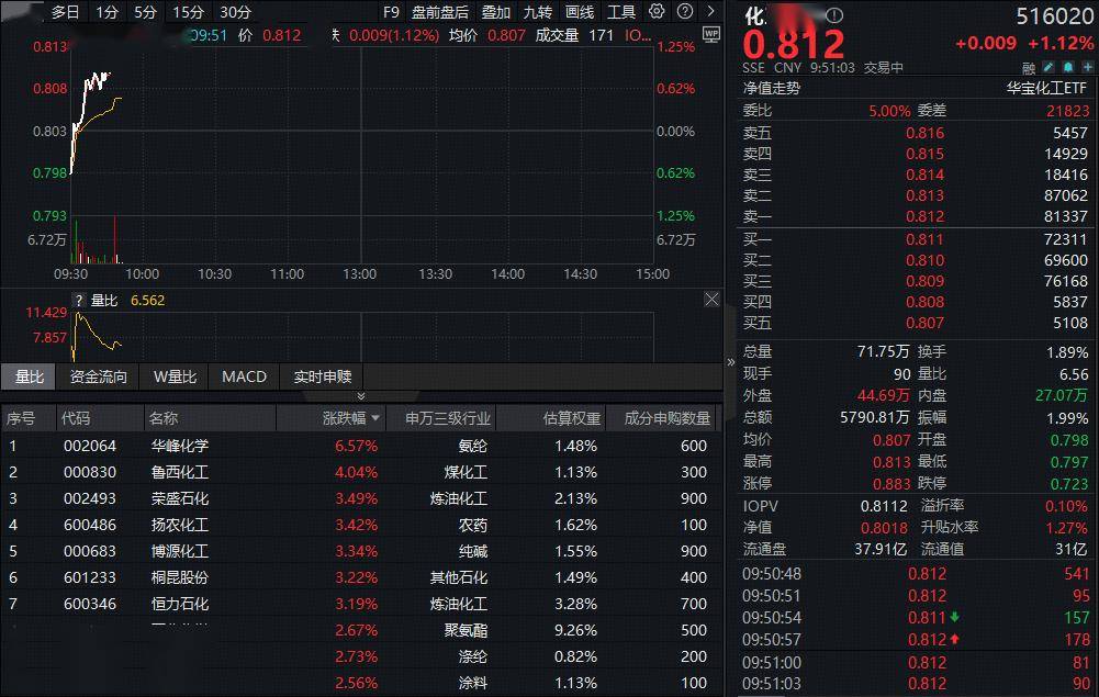 消息面上,碳酸锂继续大涨,12月17日,广期所碳酸锂期货大幅上涨,主力合约盘中逼近11万元/吨。行情数据显示,12月17日,国内碳酸锂 2605主力合约盘中一度上涨8.84%,最高报价达10.986万元/吨,创2024年5月10日以来新高,收盘涨幅7.61%,报10.862万元/吨。今年下半年, 碳酸锂期货价格明显上涨,最新价较年内低点已累计上涨84.1%。 东莞证券表示,看好锂电池产业链周期复苏。动力电池方面,海外新兴市场增长迅猛,有望继续拉动出口保持增长韧性。预计2026年全球新能 源汽车销量增速约达17%,全球动力电池需求同比增长约20%。储能电池方面,2026年全球储能市场将延续高速增长,储能电池需求增速预计 达50%左右,储能电芯供需紧张格局可能将持续至2026年年中。 化工板块今日(12月18日)继续猛攻!反映化工板块整体走势的化工ETF(516020)开盘后震荡上行,截至发稿,场内价格涨1.12%。 成份股方面,氨纶、石化、煤化工等板块部分个股涨幅居前。截至发稿,华峰化学飙涨超6%,鲁西化工大涨超4%,荣盛石化、扬农化工、博 源化工等多股跟涨超3%。 | | | 多日 1分 5分 15分 30分 ...