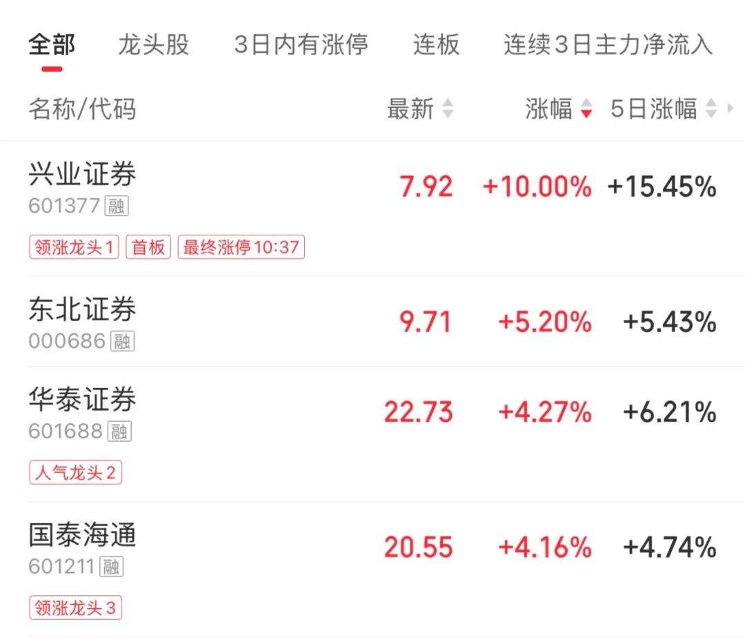 | 実部 龙头股 | 3日内有涨停 | 连板 | 连续3日主力净流入 | | --- | --- | --- | --- | | 名称/代码 | | 最新 ◆ | 涨幅 ◆ 5日涨幅 ◆ ▶ | | 兴业证券 | | | 7.92 +10.00% +15.45% | | 601377 融 | | | | | 领涨龙头1 首板 | 最终涨停10:37 | | | | 东北证券 | | 9.71 | +5.20% +5.43% | | 000686 融 | | | | | 华泰证券 | | 22.73 | +4.27% +6.21% | | 601688 融 | | | | | 人气龙头 2 | | | | | 国泰海通 | | 20.55 | +4.16% +4.74% | | 601211 融 | | | | | 领涨龙头3 | | | | 本报记者 于宏 12月8日上午,三大指数集体上涨,证券板块表现活跃,板块内个股全线上涨,截至午间收盘,A股证券板块上涨2.09%,成交额超517亿元,主力资金净 流入额超27亿元。 除因并购重组事项停牌的中金公司(601995)、信达证券(601059)、东兴证券外,板块 ...