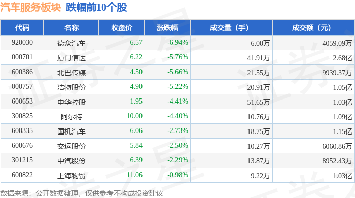 | 代码 | 名称 | 收盘价 | 涨跌幅 | 成交量(手) | | 成交额(元) | | --- | --- | --- | --- | --- | --- | --- | | 920030 | 德众汽车 | 6.57 | -6.94% | | 6.00万 | 4059.09万 | | 000701 | 厦门信达 | 6.22 | -5.76% | | 41.91万 | 2.68亿 | | 600386 | 北巴传媒 | 4.50 | -5.66% | | 21.55万 | 9939.37万 | | 000757 | 浩物股份 | 4.90 | -5.22% | 1 | 20.91万 | 1.05亿 | | 600653 | 申博控股 | 1.95 | -4.41% | | 51.65万 | 1.03亿 | | 300825 | 阿尔特 | 10.00 | -4.40% | | 10.76万 | 1.09亿 | | 600335 | 国机汽车 | 6.06 | -2.73% | | 18.75万 | 1.15亿 | | 600676 | 交运股份 | 5.84 | -2.50% | | 10.27万 | 6 ...