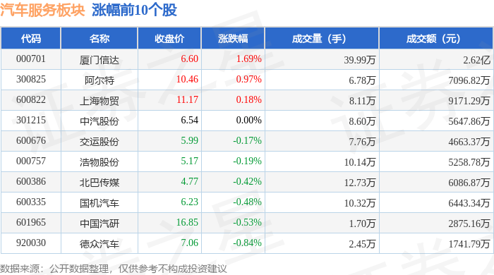 从资金流向上来看,当日汽车服务板块主力资金净流出1.01亿元,游资资金净流入4265.55万元,散户资 金净流入5866.52万元。汽车服务板块个股资金流向见下表: | 代码 | 名称 | 收盘价 | 涨跌幅 | 成交量(手) | 成交额(元) | | | --- | --- | --- | --- | --- | --- | --- | | 000701 | 厦门信达 | 6.66 | -7.24% | 83.25万 | | 5.53亿 | | 000757 | 浩物股份 | 5.29 | -4.17% | 23.77万 | | 1.27亿 | | 600653 | 申传控股 | 2.12 | -4.07% | 73.51万 | | 1.56亿 | | 920030 | 德众汽车 | 7.30 | -2.28% | 4.51万 | 3304.79万 | | | 301215 | 中汽股份 | 6.55 | -1.80% | 14.47万 | 9475.68万 | | | 600386 | 北巴传媒 | 4.99 | -1.77% | 13.07万 | 6519.70万 | | | 600676 | 交运股份 ...