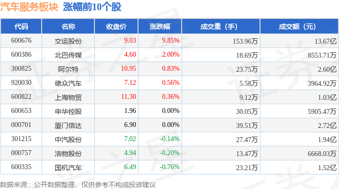 证券之星消息,1月14日汽车服务板块较上一交易日上涨0.87%,交运股份领涨。当日上证指数报收于 4126.09,下跌0.31%。深证成指报收于14248.6,上涨0.56%。汽车服务板块个股涨跌见下表: | 代码 | 名称 | 收盘价 | 涨跌幅 | 成交量(手) | | 成交额(元) | | --- | --- | --- | --- | --- | --- | --- | | 600676 | 交运股份 | 9.03 | 9.85% | | 153.96万 | 13.67亿 | | 600386 | 北巴传媒 | 4.60 | 2.00% | | 18.69万 | 8553.71万 | | 300825 | 阿尔特 | 10.95 | 0.83% | | 23.75万 | 2.60亿 | | 920030 | 德众汽车 | 7.12 | 0.56% | | 5.58万 | 3964.92万 | | 600822 | 上海物贸 | 11.30 | 0.36% | | 9.12万 | 1.03亿 | | 600653 | 申博控股 | 1.96 | 0.00% | | 30.05万 | 5905.47万 | ...