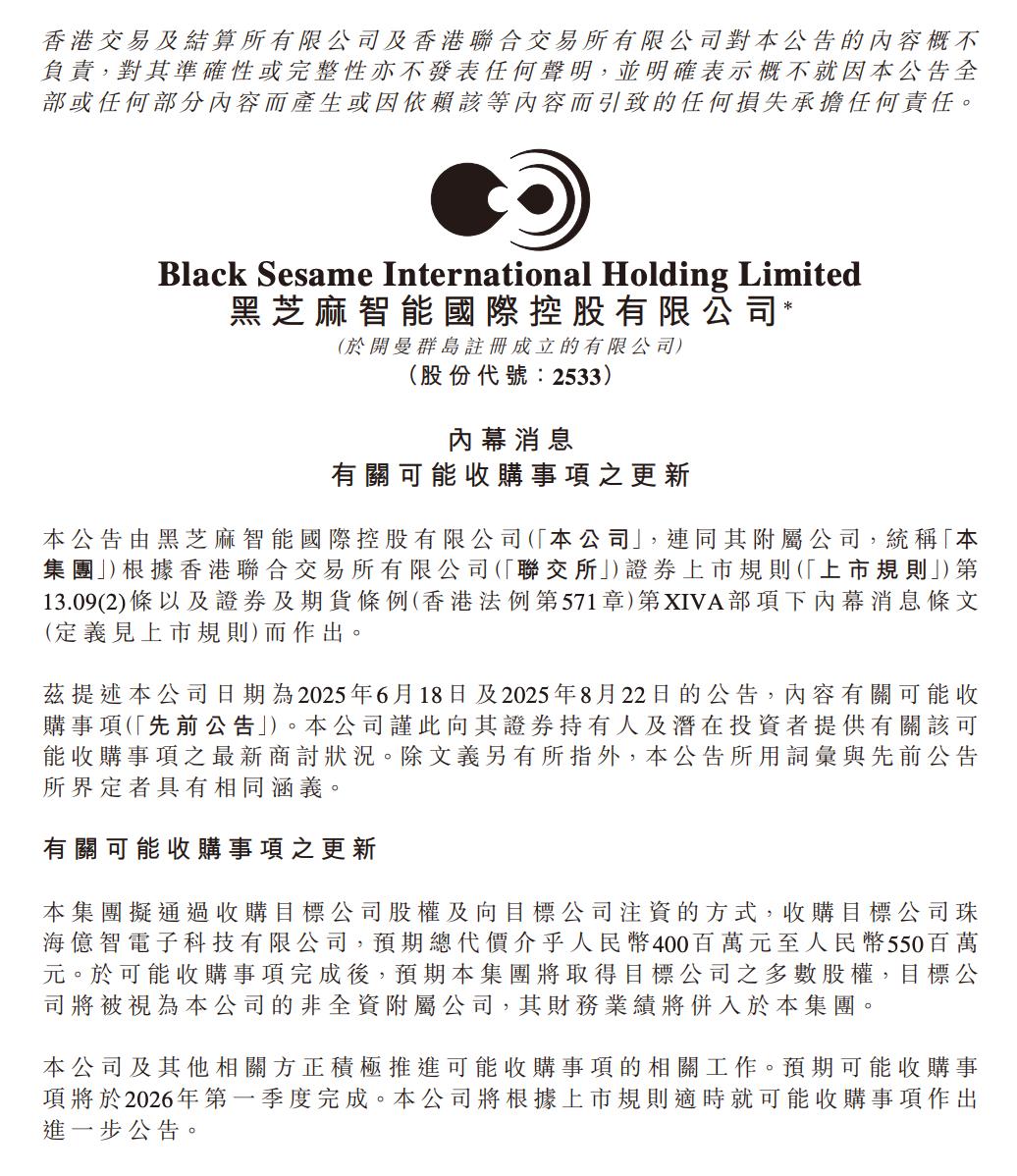 公告称,黑芝麻智能拟通过股权收购及注资方式收购亿智电子,预期总代价约人民币4亿元至5.5亿元。收购完成 后,亿智电子将成为黑芝麻智能的非全资附属公司,其财务业绩将正式并入集团报表,预期交易将于2026年第一 季度完成。 此前,黑芝麻智能已于6月18日披露了有关此次收购的初步意向,但当时并未透露目标公司的具体名称,最新公告 或表明,双方谈判已进入"深水区"。 12月2日,智能汽车计算芯片领域独角兽黑芝麻智能国际控股有限公司(以下简称为"黑芝麻智能")发布公告称, 公司拟斥资4亿至5.5亿元收购端侧AI芯片公司亿智电子。 尤为值得关注的是,亿智电子2024年完成新一代车规级芯片流片并获得车企定点项目,其在端侧视觉AI算法上的 积累,与黑芝麻智能的车规级算力平台形成天然互补。 黑芝麻智能也在此前的公告中称,此次潜在收购将产生显著的战略协同效应,主要体现在完善产品矩阵、拓展新 赛道以及运营协同互补三个维度。 "该潜在收购将能使集团能够提供高中低端全系覆盖的车规级计算芯片,并为智能汽车提供全场景解决方案。同 时,该交易亦将促进集团产品拓展至更广泛的机器人应用,提供AI推理芯片全系产品及解决方案。其将为集团及 标的公司在 ...