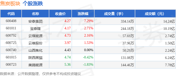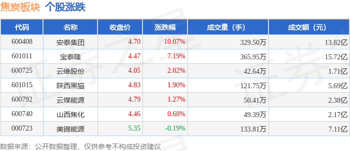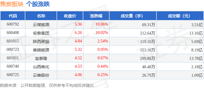 证券之星消息,11月14日焦炭板块较上一交易日上涨2.47%,云煤能源领涨。当日上证指数报收于 3990.49,下跌0.97%。深证成指报收于13216.03,下跌1.93%。焦炭板块个股涨跌见下表: | 代码 | 名称 | 收盘价 | 涨跌幅 | 成交量(手) | 成交额(元) | | | --- | --- | --- | --- | --- | --- | --- | | 600792 | 云煤能源 | 5.36 | 10.06% | 69.31万 | | 3.51亿 | | 600408 | 安泰集团 | 6.26 | 10.02% | 212.64万 | | 13.16亿 | | 601015 | 陕西黑猫 | 4.84 | 2.54% | 119.10万 | | 5.69亿 | | 000723 | 美锦能源 | 5.32 | 0.95% | 153.10万 | | 8.19亿 | | 601011 | 宝泰隆 | 4.52 | 0.67% | 299.88万 | | 13.78亿 | | 600740 | 山西焦化 | 4.53 | 0.44% | 48.48万 | | 2.18亿 | | 60 ...