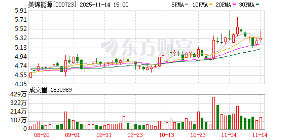 11月14日,美锦能源盘中上涨2.09%,截至11:09,报5.38元/股,成交3.69亿元,换手率1.58%,总市值 236.91亿元。 资金流向方面,主力资金净流出958.46万元,特大单买入2944.87万元,占比7.97%,卖出3110.99万元, 占比8.42%;大单买入7908.14万元,占比21.40%,卖出8700.47万元,占比23.55%。 美锦能源所属申万行业为:煤炭-焦炭Ⅱ-焦炭Ⅲ。所属概念板块包括:清洁能源、天然气、低价、煤化 工、氢能源等。 截至9月30日,美锦能源股东户数23.40万,较上期减少5.91%;人均流通股18791股,较上期增加 6.29%。2025年1月-9月,美锦能源实现营业收入129.75亿元,同比减少9.71%;归母净利润-7.37亿元, 同比减少12.57%。 分红方面,美锦能源A股上市后累计派现19.76亿元。近三年,累计派现0.00元。 机构持仓方面,截止2025年9月30日,美锦能源十大流通股东中,国泰中证煤炭ETF(515220)位居第 二大流通股东,持股1.22亿股,相比上期增加7394.42万股。南方中证500ETF(510500)位居第五大流 ...