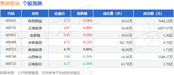 | 代码 | 名称 | 主力净流入(元) | 主力净占比 游资净流入 (元) | | 游资净占比 散户净流入 (元) | | 散户净占比 | | --- | --- | --- | --- | --- | --- | --- | --- | | 601011 | 宝泰降 | 1.53万 | 0.01% | -566.50万 | -3.18% | 564.97万 | 3.17% | | 601015 陕西黑猫 | | -182.11万 | -1.80% | -427.33万 | -4.23% | 609.44万 | 6.03% | | 600792 云煤能源 | | -397.69万 | -3.99% | -364.51万 | -3.65% | 762.20万 | 7.64% | | 600740 山西焦化 | | -400.87万 | -5.97% | 227.74万 | 3.39% | 173.14万 | 2.58% | | 000723 美锦能源 | | -1502.71万 | -6.23% | -116.44万 | -0.48% | 1619.15万 | 6.71% | | 600725 云维股份 | ...