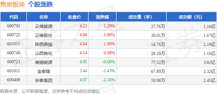 证券之星消息,1月26日焦炭板块较上一交易日下跌0.03%,安泰集团领跌。当日上证指数报收于 4132.61,下跌0.09%。深证成指报收于14316.64,下跌0.85%。焦炭板块个股涨跌见下表: | 代码 | 名称 | 收盘价 | 涨跌幅 | 成交量(手) | 成交额(元) | | | --- | --- | --- | --- | --- | --- | --- | | 600792 | 云煤能源 | 4.22 | 1.20% | 27.76万 | | 1.16 Z | | 600725 | 云维股份 | 4.68 | 1.08% | 36.01万 | | 1.67亿 | | 601015 | 陕西黑猫 | 4.04 | 1.00% | 54.76万 | | 2.19亿 | | 600740 | 山西焦化 | 4.14 | 0.98% | 1 28.10万 | | 1.16亿 | | 000723 | 美锦能源 | 4.95 | -0.60% | 77.32万 | | 3.82亿 | | 601011 | 宝泰隆 | 3.44 | -1.43% | 67.89万 | | 2.32 乙 | | 60040 ...