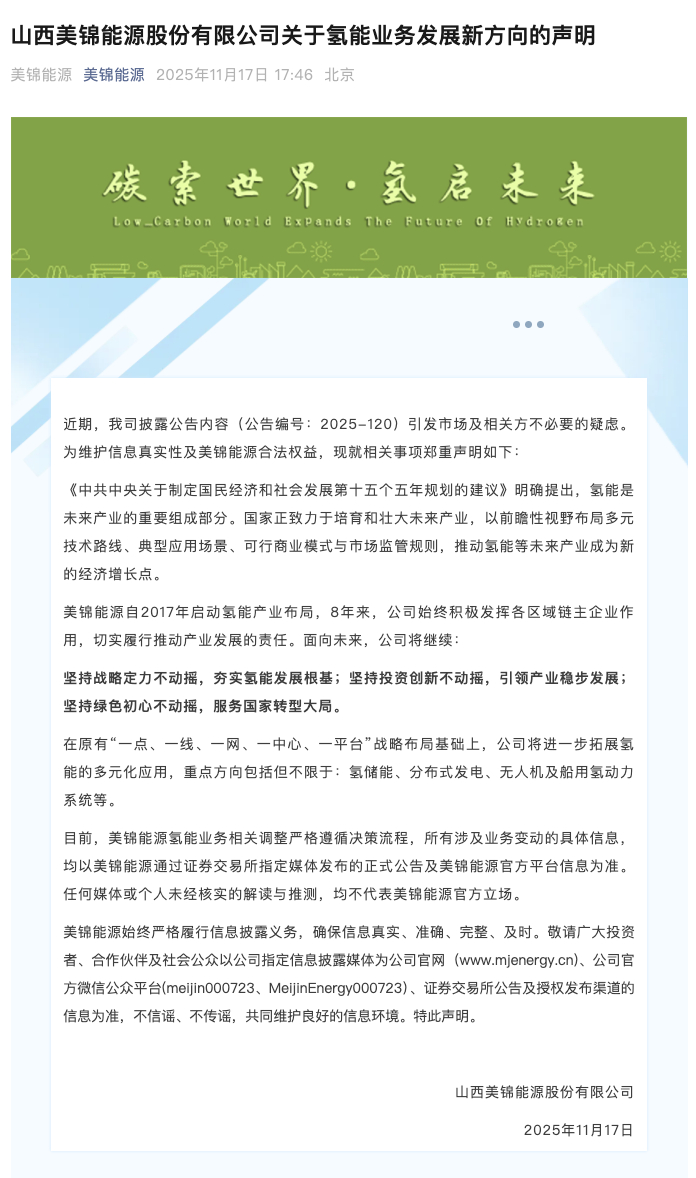 Core Viewpoint - The company, Shanxi Meijin Energy Co., Ltd., reaffirms its commitment to the hydrogen energy industry despite recent project terminations, emphasizing its strategic focus on innovation and green development [1][6]. Group 1: Company Strategy - The company has been actively involved in the hydrogen energy sector since 2017, positioning itself as a regional leader and fulfilling its responsibility in industry development [1][6]. - The company will continue to adhere to three main principles: maintaining strategic determination, promoting investment innovation, and upholding its green mission [6][7]. - The company plans to expand its hydrogen energy applications, focusing on hydrogen storage, distributed power generation, and hydrogen-powered systems for drones and ships [1][6]. Group 2: Project Termination - The termination of the hydrogen fuel cell power system and commercial vehicle components production project was influenced by significant changes in the external environment, including the failure of Jinzhong City to become a national demonstration city for fuel cell vehicles [4][5]. - The project was initially planned to receive 600 million yuan from the funds raised through a convertible bond issuance, but this amount was later reduced to 250 million yuan due to multiple decision adjustments [4][5]. - The company has decided to permanently allocate the remaining raised funds to enhance liquidity and optimize resource allocation, ensuring that core business operations remain unaffected [5][6]. Group 3: Market Position and Future Outlook - The company aims to leverage its existing resources, such as completed assembly workshops and hydrogen stations, through a platform-based, integrated light asset operation model to attract partners for collaborative development [6][7]. - This strategic adjustment is seen as a way to mitigate risks associated with unclear technology routes in the commercial vehicle sector while seizing opportunities in energy storage and specialized equipment [6][7]. - Analysts suggest that the company's adaptability in a complex market environment, combined with its commitment to hydrogen energy, positions it well for future growth and value creation for investors [7].