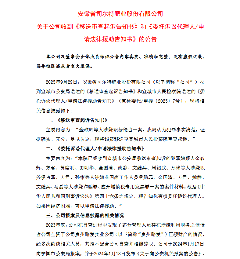 近日,上市公司司尔特披露的移送审查起诉案件中,除公司内部多名前任高管涉案外,该案还牵扯出国元证券的一名保代,或为2025年首例保荐代表人被移 送审查起诉的案例。 9月29日,安徽省司尔特肥业股份有限公司(以下简称为"司尔特")公告称,公司近日已收到宣城市公安局送达的《移送审查起诉告知书》和宣城市人民检 察院送达的《委托诉讼代理人/申请法律援助告知书》,公司前任高管及中介机构人员的职务侵占案件已移送至宣城市人民检察院审查起诉。 在犯罪嫌疑人名单中,除了司尔特前董事长金国清、前总经理金政辉(两人系父子)等高管外,国元证券保荐代表人孙彬也赫然在列,涉嫌罪名分别为职务 侵占罪及非国家工作人员受贿罪。根据公司以往项目信息,孙彬曾担任公司2起项目保荐人。 公告披露,"涉嫌的主要犯罪事实包括上述人员涉嫌利用职务之便,长期侵占公司以及全资子公司贵州路发等的巨额财产;涉嫌虚构尿素采购交易将公司资 金转出,再虚构有机肥销售回流部分资金并骗取政府补贴;涉嫌在虚构尿素采购交易的过程中接受虚开的增值税专用发票;涉嫌为实施上述犯罪行为而发生 的非国家工作人员受贿等行为"。 据了解,这起案件始于2023年底,司尔特在新旧股东更替后进行的内 ...