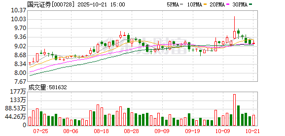 10月17日,国元证券盘中下跌2.03%,截至14:21,报9.16元/股,成交4.86亿元,换手率1.20%,总市值 399.72亿元。 资金流向方面,主力资金净流出1998.08万元,特大单买入6063.45万元,占比12.47%,卖出6189.34万 元,占比12.73%;大单买入1.31亿元,占比26.85%,卖出1.49亿元,占比30.70%。 国元证券今年以来股价涨11.71%,近5个交易日跌1.82%,近20日跌0.33%,近60日涨11.17%。 资料显示,国元证券股份有限公司位于安徽省合肥市梅山路18号,成立日期1997年6月6日,上市日期 1997年6月16日,公司主营业务涉及证券的代理买卖;证券自营买卖;证券承销;证券投资咨询;客户资产管 理等。主营业务收入构成为:自营业务42.98%,财富信用业务29.39%,其他业务13.47%,国际业务 5.24%,期货业务4.65%,投资银行业务2.66%,资产管理业务1.62%。 责任编辑:小浪快报 国元证券所属申万行业为:非银金融-证券Ⅱ-证券Ⅲ。所属概念板块包括:安徽国资、证金汇金、 MSCI中国、参股基金、中盘等。 截至10月10日,国元 ...