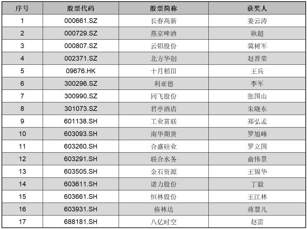 Core Points - The 2025 Crystal Ball Awards for listed companies were announced, attracting participation from over 100 companies, with awards in four categories: information disclosure, investor relations, shareholder returns, and ESG [1][2] - The awards also recognized individual achievements, with 17 chairpersons, 3 general managers, 4 CFOs, 40 secretaries, 18 representatives, and 7 IR professionals receiving accolades [3] Company Awards - **Information Disclosure Award**: Recognizes companies for their transparency and quality of information shared with investors [3] - **Investor Relations Award**: Acknowledges companies that excel in maintaining effective communication with their investors [3] - **Shareholder Returns Award**: Highlights companies that provide significant returns to their shareholders [3] - **ESG Award**: Focuses on companies that demonstrate strong environmental, social, and governance practices [3] Individual Awards - **Best Chairpersons**: A total of 17 chairpersons received recognition, including individuals from companies like Changzhai Shangs (专云污) and Yanjing Beer (耿超) [4] - **Best General Managers**: 3 general managers were awarded, with notable winners including Xu Yuexiang from Yanjing Beer [5] - **Best CFOs**: 4 CFOs were recognized for their contributions to financial management [5] - **Best Secretaries**: 40 secretaries were awarded for their roles in corporate governance and communication [5] - **Best Representatives**: 18 representatives received accolades for their effectiveness in investor relations [6] - **Best IR Professionals**: 7 IR professionals were recognized for their excellence in investor engagement [6]