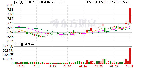 声明:市场有风险,投资需谨慎。本文为AI大模型基于第三方数据库自动发布,任何在本文出现的信 息(包括但不限于个股、评论、预测、图表、指标、理论、任何形式的表述等)均只作为参考,不构成 个人投资建议。受限于第三方数据库质量等问题,我们无法对数据的真实性及完整性进行分辨或核验, 因此本文内容可能出现不准确、不完整、误导性的内容或信息,具体以公司公告为准。如有疑问,请联 系biz@staff.sina.com.cn。 责任编辑:小浪快报 登录新浪财经APP 搜索【信披】查看更多考评等级 2026年2月27日,四川美丰(sz000731)触及涨停,涨停价7.89元,涨幅10.04%,总市值43.30亿元,流 通市值43.30亿元,截止发稿,总成交额3.00亿元。 根据喜娜AI异动分析,四川美丰涨停原因可能如下,股份回购+关联交易+公司治理优化: 1、公司累计 注销1.79%股份,直接提升了股东权益和每股价值,这一举措向市场传递了公司对自身价值的认可和对 股东负责的态度,增强了投资者信心。2026年预计关联交易额达22.86亿元,同比增长40.9%,关联交易 保障了业务的稳定开展,有助于公司在行业下行压力下维持运营。 ...