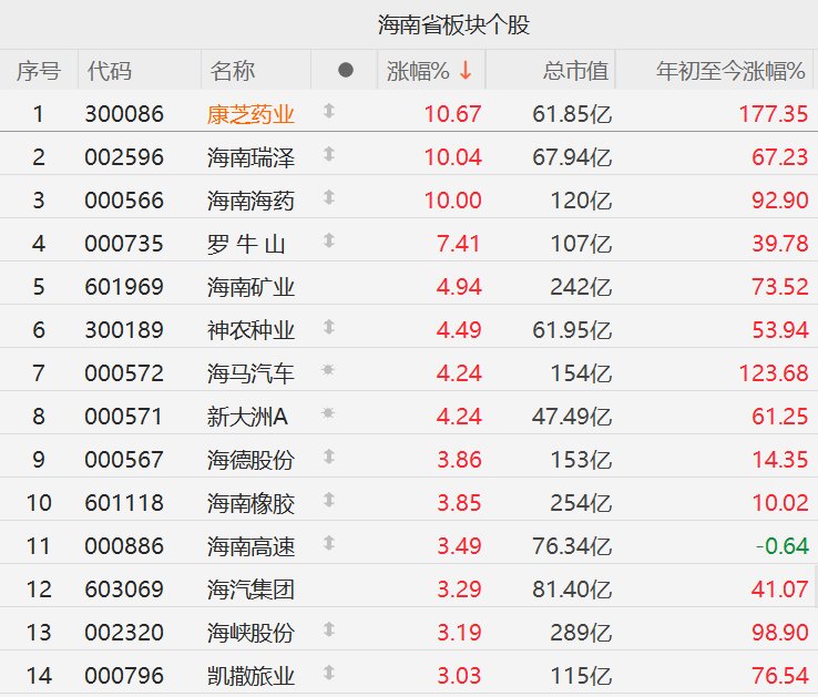 格隆汇11月26日|A股市场海南板块集体活跃,其中,康芝药业涨超10%,海南瑞泽、海南海药(维权) 10CM涨停,罗牛山涨超7%,新大洲A、海南矿业、神农种业、海马汽车涨超4%,海德股份、海南橡 胶、海南高速、海汽集团、海峡股份、凯撒旅业(维权)涨超3%。 | | | | | 海南省板块个股 | | | | --- | --- | --- | --- | --- | --- | --- | | 序号 | 代码 | 名称 | | 涨幅% ↓ | 总市值 | 年初至今涨幅% | | 1 | 300086 | 康芝药业 | 1 | 10.67 | 61.85亿 | 177.35 | | 2 | 002596 | 烘壁座史 | 1 | 10.04 | 67.94 Z | 67.23 | | 3 | 000566 | 海南海约 | 1 | 10.00 | 120亿 | 92.90 | | 4 | 000735 | 罗牛山 | 1 | 7.41 | 107亿 | 39.78 | | 5 | 601969 | 一月屋原 | | 4.94 | 242亿 | 73.52 | | 6 | 300189 | 神农种业 | 1 | ...