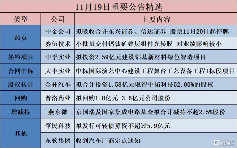 | | | 11月19日重要公告精选 | | --- | --- | --- | | 类型 | 公司 | 主要内容 | | 热点 | 中金公司 | 拟吸收合并东兴证券、信达证券 股票11月20日起停牌 | | | 赛伍技术 | 小批量交付钙钛矿叠层组件光转膜 对业绩影响较小 | | 签约项目 | 中孚实业 | 拟投资2.59亿元建设铝基新材料绿色智造项目 | | 合同中标 | 大丰实业 | 中标国际演艺中心建设工程舞台工艺设备工程I标段项目 | | 股权转让 | 金杯汽车 | 拟合计投资1.58亿元取得中拓科技52.00%的股权 | | 回购 | 普洛药业 | 拟回购1.8亿元-3.6亿元公司股份 | | 增减持 | 燕东微 | 京国瑞及国家集成电路基金拟合计减持不超2.5%股份 | | 其他 | 肇民科技 | 拟发行可转债募资不超过5.9亿元 | | | 东软集团 | 收到汽车厂商定点通知 与同居工 | 【热点】 中金公司(601995.SH):拟吸收合并东兴证券、信达证券 股票11月20日起停牌 赛伍技术(603212.SH):小批量交付钙钛矿叠层组件光转膜 对业绩影响较小 【项目投资】 中孚实业(600 ...