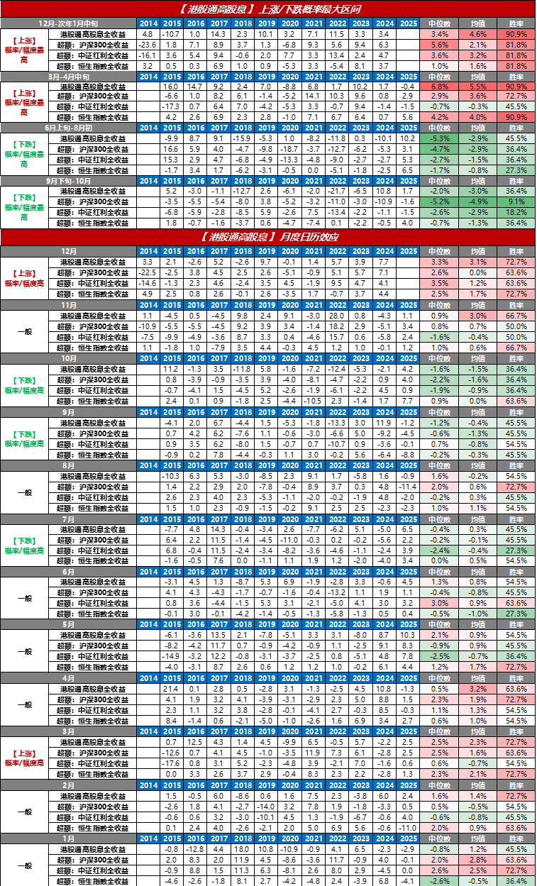 广发证券发布研报称,港股通高股息全收益指数即将迎来一年中日历效应最强的时候(12月-次年1月中旬),该阶段获得绝对收益/超额收益的概率大、收益 率高。当前建议关注港股通高股息的配置机会,可能会是一个潜在的岁末年初增加收益的方式。2014年至今,12月-1月中旬,相对于300全收益、中证红 利全收益、恒生指数全收益,胜率均是82%,绝对收益的胜率为91%,并且当前成交额占比仅为6.1%,拥挤度处于历史相对较低位置,可能是再布局机 会。 广发证券主要观点如下: 港股通高股息全收益指数即将迎来一年中日历效应最强的时候(12月-次年1月中旬),该阶段获得绝对收益/超额收益的概率大、收益率高。 (4)VS恒生指数全收益:超额收益的概率为81.8%,中位数和均值为1.0%和1.6%。跑输是由于20年末、22年末腾讯的超预期上涨。 | 【港股通高股息】上涨/下跌概率最大区间 | 2016 | 2017 | 2018 | 2019 | 2020 | 2021 | 2022 | 2023 | 2024 | 2025 | 中位数 | 均值 | 2014 | 2015 | 12月-次年1月中旬 | Hotels | | | | | ...