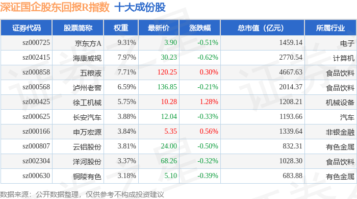 证券之星消息,11月20日,深证国企股东回报R(470064)指数报收于2243.24点,涨0.03%,成交219.45 亿元,换手率0.91%。当日该指数成份股中,上涨的有16家,北新建材以5.69%的涨幅领涨,下跌的有27 家,飞亚达以2.81%的跌幅领跌。 深证国企股东回报R(470064)指数十大成份股详情如下: | 证券代码 | 股票简称 | 权重 | 最新价 | 涨跌幅 | 总市值(亿元) | | 所属行业 | | --- | --- | --- | --- | --- | --- | --- | --- | | sz000725 | 京东方A | 9.31% | 3.90 | -0.51% | | 1459.14 | 电子 | | sz002415 | 海康威视 | 7.97% | 30.23 | -0.62% | | 2770.54 | 十算机 | | sz000858 | 五根液 | 7.71% | 120.25 | 0.30% | 4 P | 4667.63 | 食品饮料 | | sz000568 | 泸州老窖 | 6.59% | 136.85 | -0.21% | A | 2014.37 ...