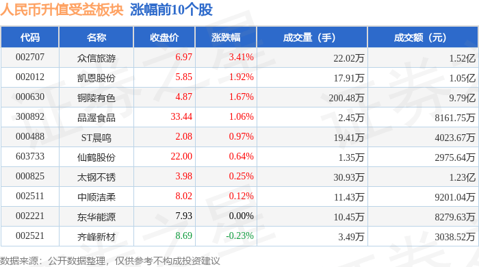 证券之星消息,11月26日人民币升值受益板块较上一交易日上涨0.54%,中国东航领涨。当日上证指数 报收于3864.18,下跌0.15%。深证成指报收于12907.83,上涨1.02%。人民币升值受益板块个股涨跌见下 表: | 代码 | 名称 | 收盘价 | 涨跌幅 | 成交量(手) | 成交额(元) | | --- | --- | --- | --- | --- | --- | | 600115 | 中国东航 | 5.06 | 2.43% | 125.88万 | 6.34亿 | | 300892 | 品屋食品 | 34.70 | 2.18% | 4.99万 | + 1.72亿 | | 002067 | 量兴纸业 | 5.51 | 1.85% | 90.42万 | 4.98 Z | | 000630 | 铜陵有色 | 5.04 | 1.00% | 211.76万 | 10.74亿 | | 605090 | 九丰能源 | 33.31 | 0.88% | 6.05万 | 2.04亿 | | 601888 | 中国中免 | 80.34 | 0.82% | 39.37万 | 31.51亿 | | 002493 | 荣 ...