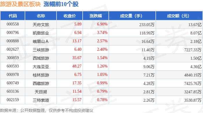 从资金流向上来看,当日旅游及景区板块主力资金净流入2.41亿元,游资资金净流出1.25亿元,散户资金 净流出1.16亿元。旅游及景区板块个股资金流向见下表: 证券之星消息,11月25日旅游及景区板块较上一交易日上涨1.21%,天府文旅领涨。当日上证指数报收 于3870.02,上涨0.87%。深证成指报收于12777.31,上涨1.53%。旅游及景区板块个股涨跌见下表: | 代码 | 名称 | 收盘价 | 涨跌幅 | 成交量(手) | 成交额(元) | | | --- | --- | --- | --- | --- | --- | --- | | 000558 | 天府文旅 | 5.89 | 6.90% | 233.05万 | | 13.67亿 | | 000796 | 凯撒旋业 | 6.94 | 3.74% | 118.99万 | | 8.07亿 | | 000888 | 峨眉山A | 13.17 | 2.57% | - 16.64万 | | 2.18亿 | | 002627 | 三峡旅游 | 6.40 | 2.40% | ﺎ 11.40万 | | 7227.33万 | | 300859 | 西域旅游 | 3 ...