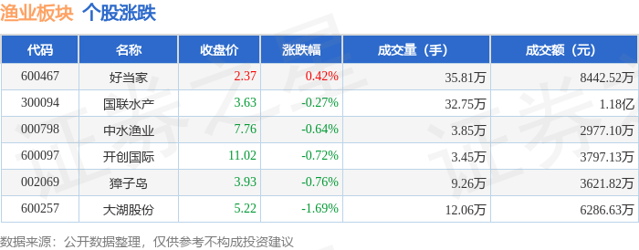 | 代码 | 名称 | 收盘价 | 涨跌幅 | 成交量(手) | 成交额(元) | | --- | --- | --- | --- | --- | --- | | 002069 | 獐子岛 | 3.95 | 1.80% | 11.04万 | 4345.16万 | | 600097 | 开创国际 | 11.14 | 1.09% | 4.28万 | 4787.02万 | | 600257 | 大湖股份 | 5.24 | 0.77% | 11.00万 | 5751.35万 | | 000798 | 中水渔业 | 7.80 | 0.39% | 4.13万 | 3222.86万 | | 600467 | 好当家 | 2.36 | -0.42% | 37.99万 | 9012.32万 | | 300094 | 国联水产 | 3.63 | -0.55% | 30.42万 | 1.11亿 | 从资金流向上来看,当日渔业板块主力资金净流出2143.92万元,游资资金净流出509.81万元,散户资金 净流入2653.73万元。渔业板块个股资金流向见下表: 证券之星消息,9月26日渔业板块较上一交易日上涨0.4%,獐子岛领涨。当日 ...